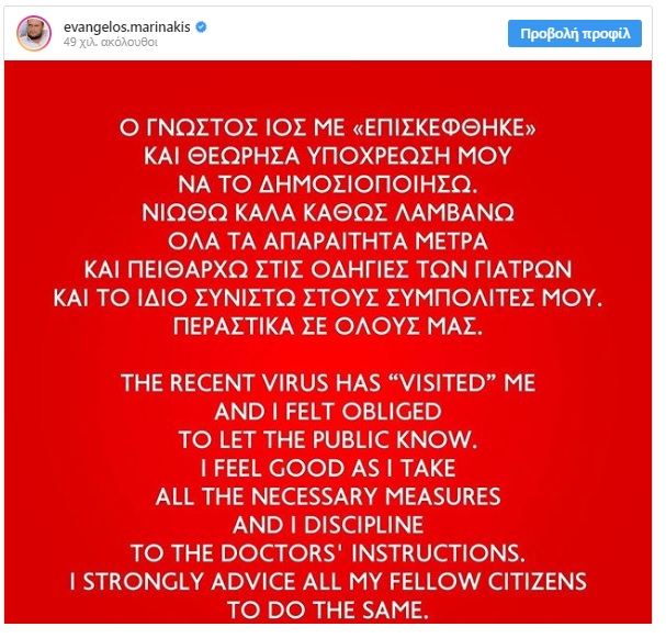 Από κορονωϊό νόσησε και ο πρόεδρος του Ολυμπιακού, εκδότης και καναλάρχης Βαγγέλης Μαρινάκης. Την είδηση γνωστοποίησε ο ίδιος με ανάρτησή του στα social media.