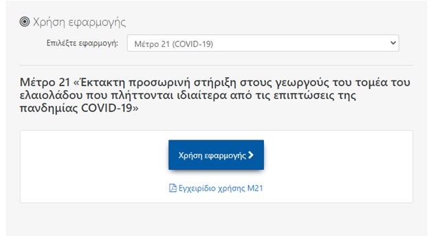 Άνοιξε η εφαρμογή για το Μέτρο 21 στον ιστότοπο του ΟΠΕΚΕΠΕ, σήμερα Τρίτη 17 Νοεμβρίου. Το Μέτρο 21 είναι ένα πρόγραμμα έκτακτης προσωρινής στήριξης του Υπουργείου Αγροτικής Ανάπτυξης για τους γεωργούς που πλήττονται ιδιαίτερα από τις επιπτώσεις της πανδημίας COVID-19, το οποίο πληρώνεται από το γνωστό «επταχίλιαρο», θέμα που ως γνωστόν πρώτη, είχε αναδείξει η «Ύπαιθρος – Χώρα».