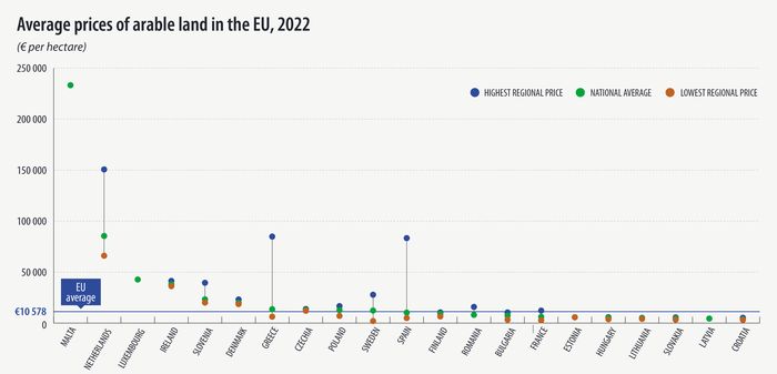 Σύμφωνα με τη Eurostat, μεταξύ των 21 κρατών-μελών της ΕΕ, η τιμή που αντιστοιχεί στην αγορά 1 εκταρίου αρόσιμης γης κυμαινόταν κατά μέσο όρο από 3.700 ευρώ στην Κροατία έως 233.230 ευρώ στη Μάλτα το 2022