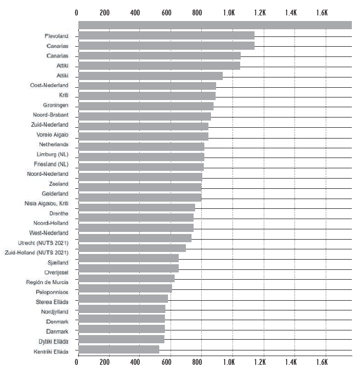 Σε περιφερειακό επίπεδο, οι υψηλότερες τιμές καταγράφηκαν στην ολλανδική περιφέρεια Flevoland (κατά μέσο όρο 150.644 ευρώ ανά εκτάριο). Αντίθετα, οι χαμηλότερες εντοπίσθηκαν στη σουηδική περιφέρεια Övre Norrland (κατά μέσο όρο 2.041 ευρώ). Ειδικότερα, σε τρεις χώρες καταγράφηκαν ιδιαίτερα έντονες περιφερειακές διακυμάνσεις στις τιμές αγοράς: