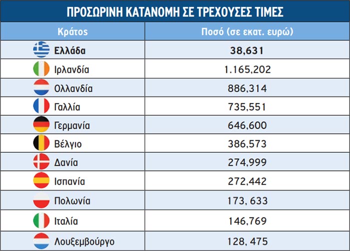 Από τις υπόλοιπες ευρωπαϊκές χώρες, τα υψηλότερα ποσά προβλέπεται να εισπράξουν η Ιρλανδία (1,165 δισ. ευρώ), η Ολλανδία (886,3 εκατ. ευρώ), η Γαλλία (735,5 εκατ. ευρώ), η Γερμανία (646,6 εκατ. ευρώ) και το Βέλγιο (386,5 εκατ. ευρώ).
