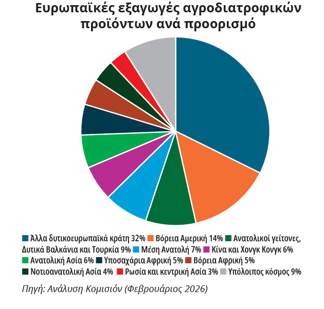 Η ΕΕ κατάφερε και το 2025 να διατηρήσει το ανταγωνιστικό της πλεονέκτημα στο διεθνές εμπόριο αγροδιατροφικών προϊόντων, παρά τις έντονες πιέσεις που προέρχονται από τις υψηλότερες τιμές εισαγωγών, οι οποίες και περιορίζουν το εμπορικό πλεόνασμα. Με βάση τα νεότερα στοιχεία της Κομισιόν για την εξέλιξη του αγροδιατροφικού εμπορίου το 2025, οι ευρωπαϊκές εξαγωγές ανήλθαν σε νέο επίπεδο ρεκόρ, στα 238,4 δισ. ευρώ (+1,2 % από την προηγούμενη χρονιά) ενισχύοντας τη θέση της ως μεγαλύτερο εξαγωγέα αγροδιατροφικών προϊόντων παγκοσμίως. Η ΕΕ, μάλιστα, ήταν η μόνη από τις πέντε κορυφαίες χώρες/περιοχές στον τομέα που αύξησε την αξία των εξαγωγών της, εν αντιθέσει με τις επιδόσεις των υπολοίπων τεσσάρων κρατών, που κατέγραψαν μειώσεις (ΗΠΑ -7%, Βραζιλία -1%, Κίνα -3% και Καναδά -6%) αναδεικνύοντας την ανθεκτικότητα του τομέα της Γηραιάς Ηπείρου, παρά τη ρευστότητα που χαρακτηρίζει το εμπόριο την τελευταία περίοδο.