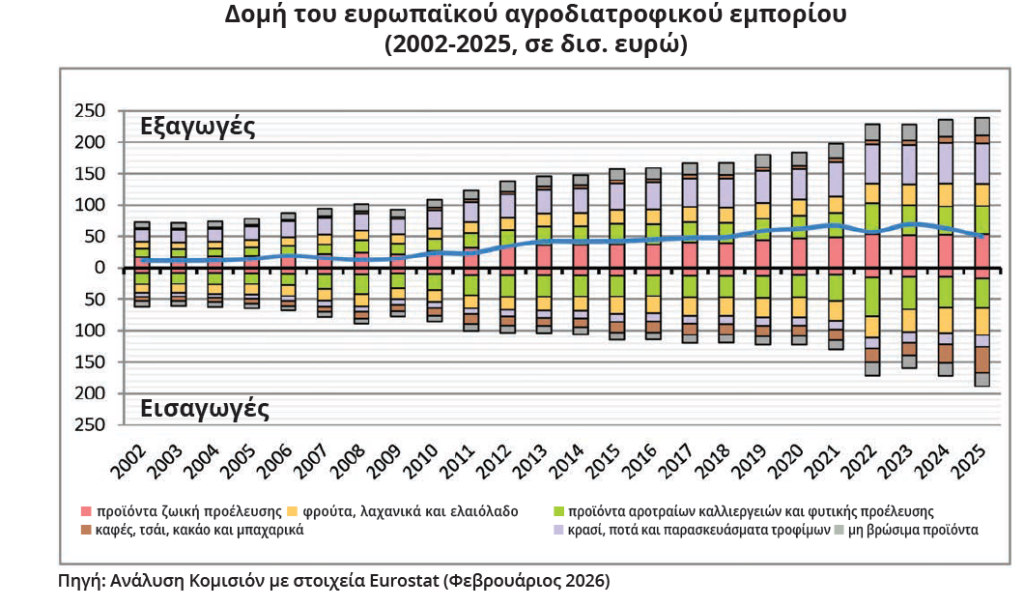 Αυξημένες, όμως, ήταν και οι εισαγωγές την ίδια χρονιά, με την αξία τους να ανέρχεται στα 188,6 δισ. ευρώ (+9% από την προηγούμενη χρονιά) και την Κοινότητα να παραμένει ο μεγαλύτερος εισαγωγέας στην κατηγορία. Η άνοδος των εισαγωγών, αποδόθηκε περισσότερο στις σαφώς υψηλότερες τιμές που είχαν ο καφές και το κακάο και λιγότερο σε εκείνες των φρούτων και ξηρών καρπών. Τα δεδομένα αυτά, περιόρισαν το πλεόνασμα του ευρωπαϊκού αγροδιατροφικού εμπορίου της ΕΕ, στα 49,9 δισ. ευρώ, χωρίς ωστόσο, να το «θέτουν υπό αμφισβήτηση» καθώς αυτό παραμένει κατά 4 φορές υψηλότερο από το 2002, με την ΕΕ να χαρακτηρίζεται «καθαρός εξαγωγέας» στις περισσότερες κατηγορίες προϊόντων. Το εμπόριο αγροδιατροφικών προϊόντων αντιπροσώπευε το 9% των συνολικών ευρωπαϊκών εξαγωγών και το 7,5% των εισαγωγών, αλλά και το 37% του συνολικού ευρωπαϊκού πλεονάσματος το 2025.