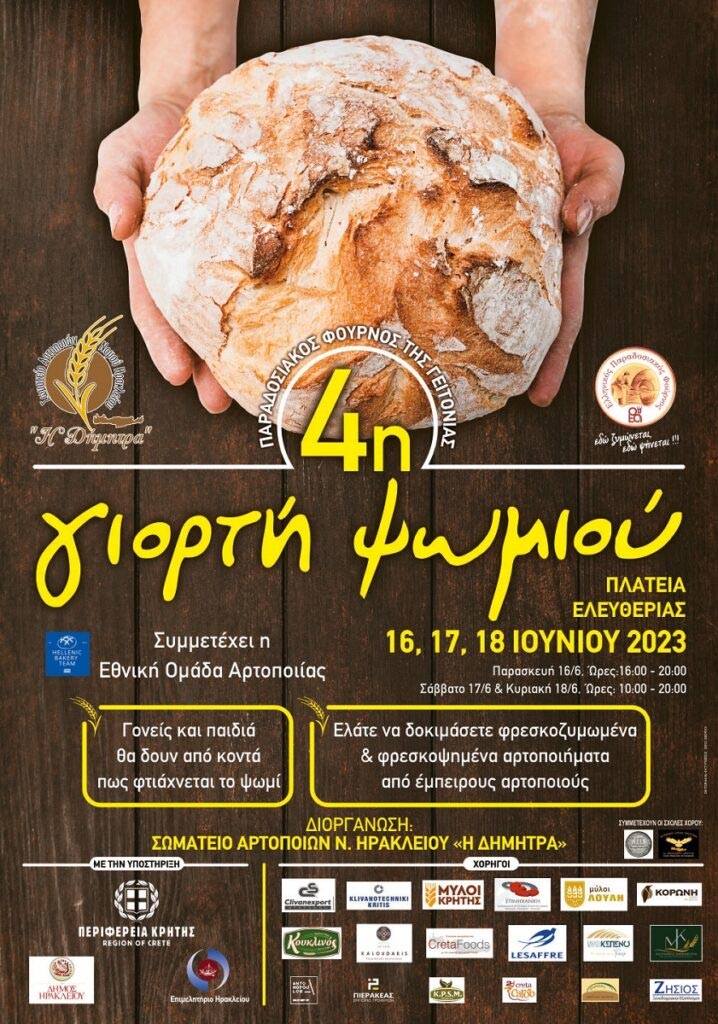 Την 4η ΓΙΟΡΤΗ ΨΩΜΙΟΥ διοργανώνει στις 16, 17 και 18 Ιουνίου 2023 το Σωματείο Αρτοποιών Ν. Ηρακλείου, με σκοπό να προβάλλει τη σημασία του Φούρνου της Γειτονιάς και να προωθήσει τα τοπικά παραδοσιακά προϊόντα αρτοποιίας στους κατοίκους και τους επισκέπτες του Ηρακλείου.