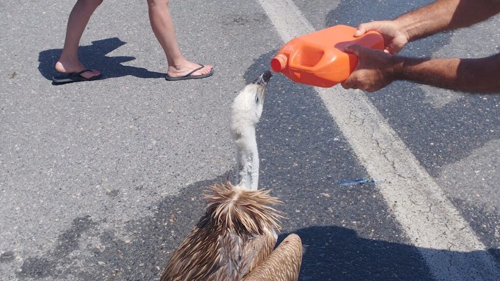 Ένας γυπαετός, ζαλισμένος πιθανόν από τις πολύ υψηλές θερμοκρασίες… προσγειώθηκε στη μέση του δρόμου αδυνατώντας να πετάξει.