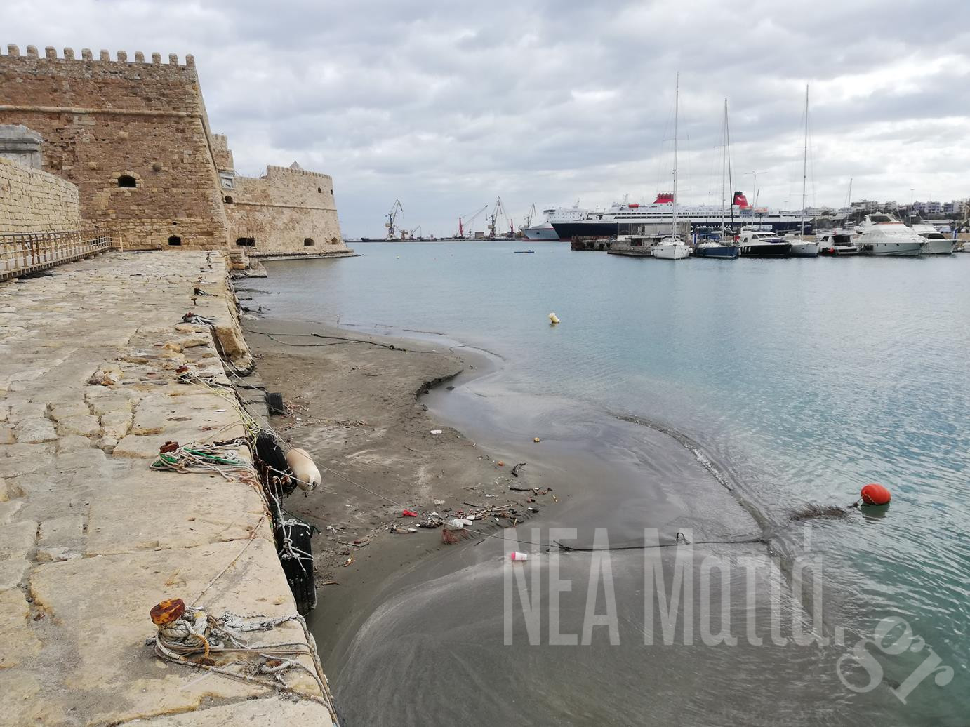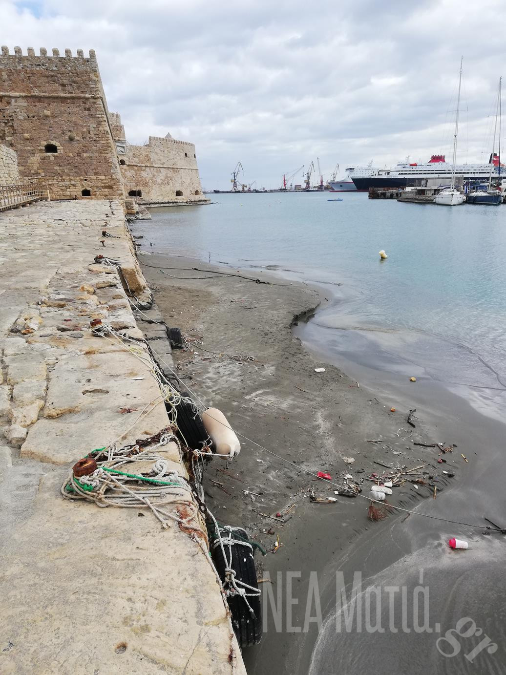 Μια μικρή αμμουδιά αποκαλύφθηκε στο βόρειο τμήμα του Ενετικού Λιμανιού, λίγα μέτρα μακριά από την πύλη του Κούλε, καθώς τα θαλασσινά νερά αποσύρθηκαν και τμήμα του βυθού είναι ορατό από τους περιπατητές, όπως φαίνεται και στις φωτό και το βίντεο της Νέας Ματιάς.