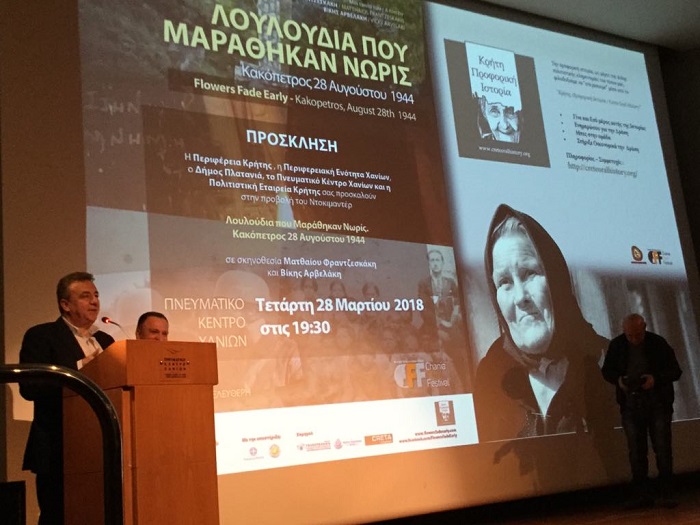 Στην σημαντικότητα του ντοκιμαντέρ αναφέρθηκαν στους χαιρετισμούς τους ο Περιφερειάρχης Κρήτης Σταύρος Αρναουτάκης, ο Αντιπεριφερειάρχης της ΠΕ Χανίων Απόστολος Βουλγαράκης, ο Δήμαρχος Πλατανιά Γιάννης Μαλανδράκης, οι οποίοι και έδωσαν θερμά συγχαρητήρια για την επιτυχημένη τους δουλειά στους σκηνοθέτες Ματθαίο Φραντζεσκάκη κα Βίκυ Αρβελάκη.