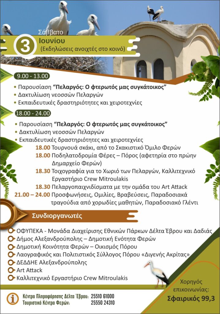 Πρόκειται για το 6ο Φεστιβάλ Πελαργών που διοργανώνεται το διήμερο 2-3 Ιουνίου δίπλα στον Αργυρορρύτη Έβρο και συγκεκριμένα στο Δημοτικό Σχολείο του Πόρου, του οποίου οι κάτοικοι είναι στενά συνδεδεμένοι με τη φύση, τον ποταμό…τους πελαργούς. Όπως είναι γνωστό από το 2016 ο Πόρος έχει συμπεριληφθεί σε ένα από τα 15 ευρωπαϊκά χωριά Πελαργών.