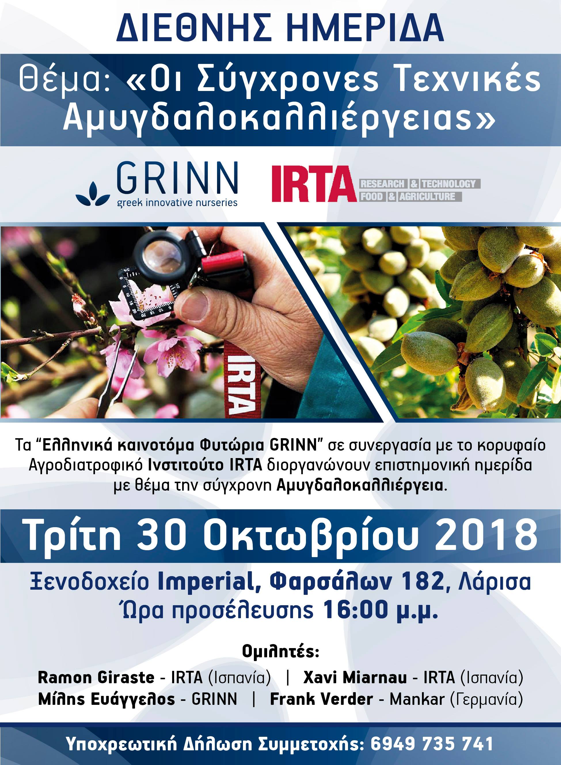 Διεθνής Ημερίδα για τις σύγχρονες τεχνικές της αμυγδαλοκαλλιέργειας πραγματοποιήθηκε στην Λάρισα την Τρίτη 30 Οκτωβρίου. Η ημερίδα διοργανώθηκε από τα Φυτώρια GRINN και το Κρατικό Αγροδιατροφικό Ινστιτούτο της Καταλωνίας IRTA.