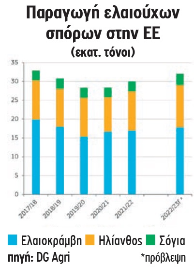 Ουκρανία: Κλειδί η διαθεσιμότητα του ηλιέλαιου Σύμφωνα με τη Mintec, εφόσον οι ξηρές καιρικές συνθήκες συνεχιστούν, δεν αποκλείεται οι τιμές του ελαιολάδου να αυξηθούν ακόμα περισσότερο. Την τάση αυτή ενδεχομένως να συγκρατήσει η απελευθέρωση των εξαγωγών σιτηρών από την Ουκρανία, αφού θα μπορούσε να οδηγήσει σε αύξηση των ποσοτήτων ηλιέλαιου, η μειωμένη διαθεσιμότητα των οποίων, όπως παραδέχεται και ο κ. Colmenero, συνέβαλε το προηγούμενο διάστημα «δραματικά» στην αύξηση των τιμών, καθώς αυξήθηκε η ζήτηση για ελαιόλαδο. Σημειωτέον ότι, σύμφωνα με την τελευταία έκθεση Βραχυπρόθεσμων Προοπτικών της Κομισιόν, την περίοδο 2022-2023 οι εκτάσεις που σπάρθηκαν με ηλίανθο στην ΕΕ αυξήθηκαν κατά 7,8% σε ετήσια βάση. Παράλληλα, η ευρωπαϊκή παραγωγή ηλιελαίου προβλέπεται να αυξηθεί 6,9% σε ετήσια βάση (βλ. διάγραμμα)και να ξεπεράσει, για πρώτη φορά από το 2017, τους 32,1 εκατ. τόνους. |