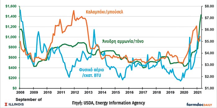 Eξέλιξη τιμής άνυδρης αμμωνίας και συσχέτιση με εξέλιξη τιμών σε καλαμπόκι και φυσικό αέριο