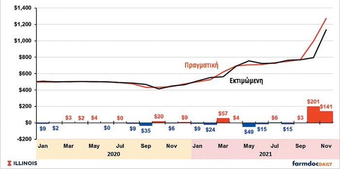 Αξίζει, τέλος, να σημειωθεί ότι αν οι τιμές στο καλαμπόκι και στο φυσικό αέριο παραμείνουν στα ίδια επίπεδα, το μοντέλο προβλέπει μια τιμή για τον Απρίλιο του 2022 που θα είναι μεν χαμηλότερη από τα τρέχοντα επίπεδα όχι, όμως, με σημαντική μείωση.