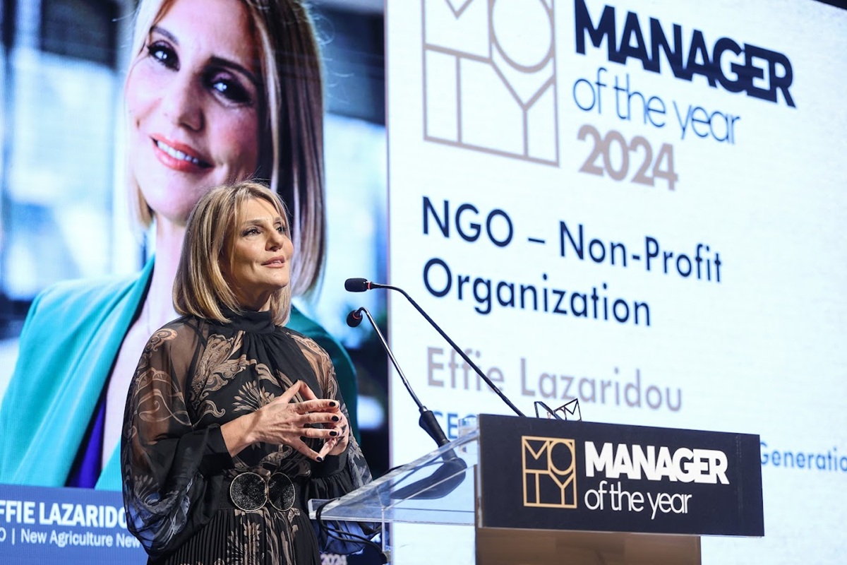 Το 2024 επιφύλασσε ακόμη μία ιδιαίτερα τιμητική διάκριση για τη Νέα Γεωργία Νέα Γενιά, καθώς η Διευθύνουσα Σύμβουλος (CEO) του Οργανισμού, κα Έφη Λαζαρίδου, βραβεύθηκε ως Manager of the Year 2024 στην κατηγορία NGO – Non-Profit Organization. Η βράβευση πραγματοποιήθηκε την Τρίτη, 3 Δεκεμβρίου, στο Μέγαρο Μουσικής Αθηνών.