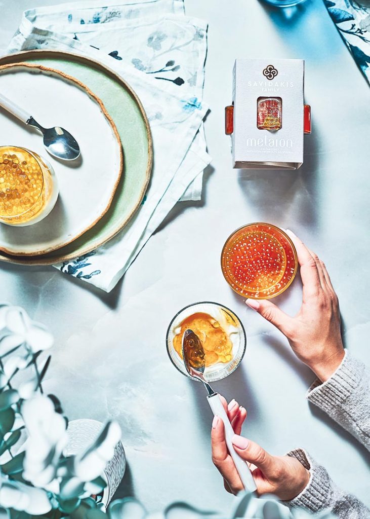 Επίσης, αλείφοντας το ψωμί, σκάνε οι σφαίρες και ομογενοποιούνται με το μέλι. Μπορεί να συνδυαστεί στη σαλάτα ως dressing, top σε γιαούρτι, στο παγωτό, σε cocktail και να στολίσει όλα τα πιάτα (food styling)». Το προϊόν κυκλοφορεί σε delicatessen καταστήματα και e-shop.