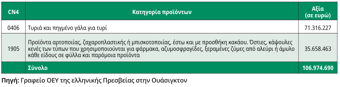 Όπως αναφέρει το Γραφείο ΟΕΥ, οι σημαντικότερες κατηγορίες προϊόντων, που επηρεάζονται από τις αλλαγές, είναι με βάση την αξία τους, πρωτίστως, αυτές των τυριών (CN0406) αξίας 71,3 εκατ. ευρώ και των προϊόντων αρτοποιίας (CN 1905) αξίας 35,7 εκατ. ευρώ, με συνολική αξία εξαγωγών ύψους 107 εκατ. ευρώ το 2025.