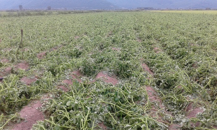 Το χαλάζι ήταν σε μέγεθος καρυδιού και προκάλεσε σε ελάχιστα λεπτά τεράστιες ζημιές σε καλαμπόκι, φασόλι, ηλίανθο αλλά κύρια στην πατάτα που ήταν σε φάση καρπόδεσης. Οι παραγωγοί εκτιμούν ότι η έκταση ξεπερνάει τα 2.500 στρέμματα και δεν προλαβαίνουν να μετρούν τις ζημιές από τη βασίλισσα των καλλιεργειών στην περιοχή.