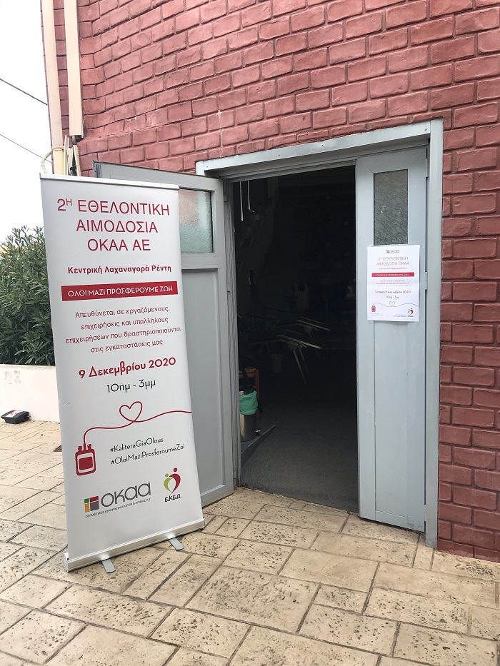 Ο Οργανισμός Κεντρικών Αγορών και Αλιείας (ΟΚΑΑ Α.Ε.) σε συνεργασία με το Εθνικό Κέντρο Αιμοδοσίας (ΕΚΕΑ) πραγματοποίησε την Τετάρτη 9 Δεκεμβρίου 2020, εθελοντική αιμοδοσία στις εγκαταστάσεις της Κεντρικής Λαχαναγοράς στον Αγ. Ιωάννη Ρέντη.