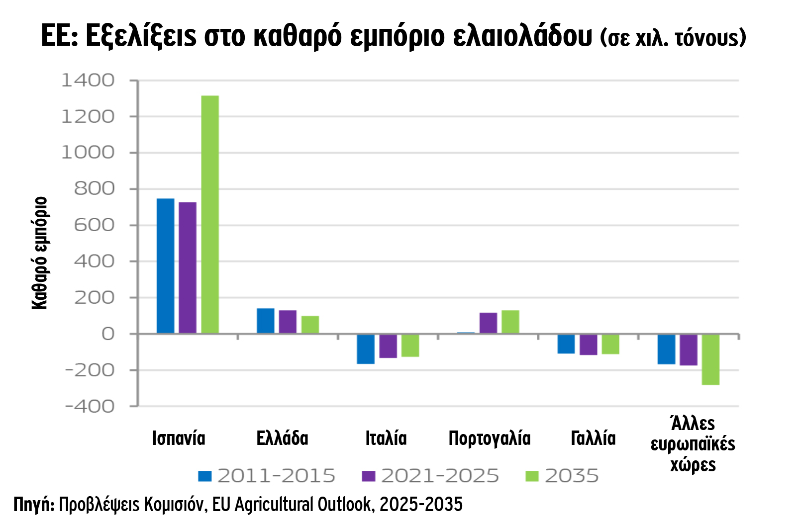Με αυτά τα δεδομένα, η ισπανική παραγωγή θα μπορούσε να αυξηθεί στους περίπου 1,8 εκατ. τόνους έως το 2035 και η πορτογαλική στους 0,2 εκατ. τόνους ετησίως. Αντίστροφα, με βάση την προβλεπόμενη μείωση των καλλιεργούμενων εκτάσεων και αποδόσεων, η ελληνική παραγωγή θα μπορούσε να οδηγηθεί σε επίπεδα κάτω των 0,18 εκατ. τόνων ετησίως, ομοίως και η ιταλική να γράφει απώλειες της τάξεως του 3%. Άλλοι παράγοντες που επηρεάζουν αρνητικά την απόδοση του κλάδου περιλαμβάνουν την κλιματική αλλαγή, τα ακραία καιρικά φαινόμενα, την έλλειψη νερού και τα εντομολογικά προβλήματα, ενώ και η Xylella fastidiosa παραμένει σοβαρό πρόβλημα σε περιοχές όπως η Απουλία.