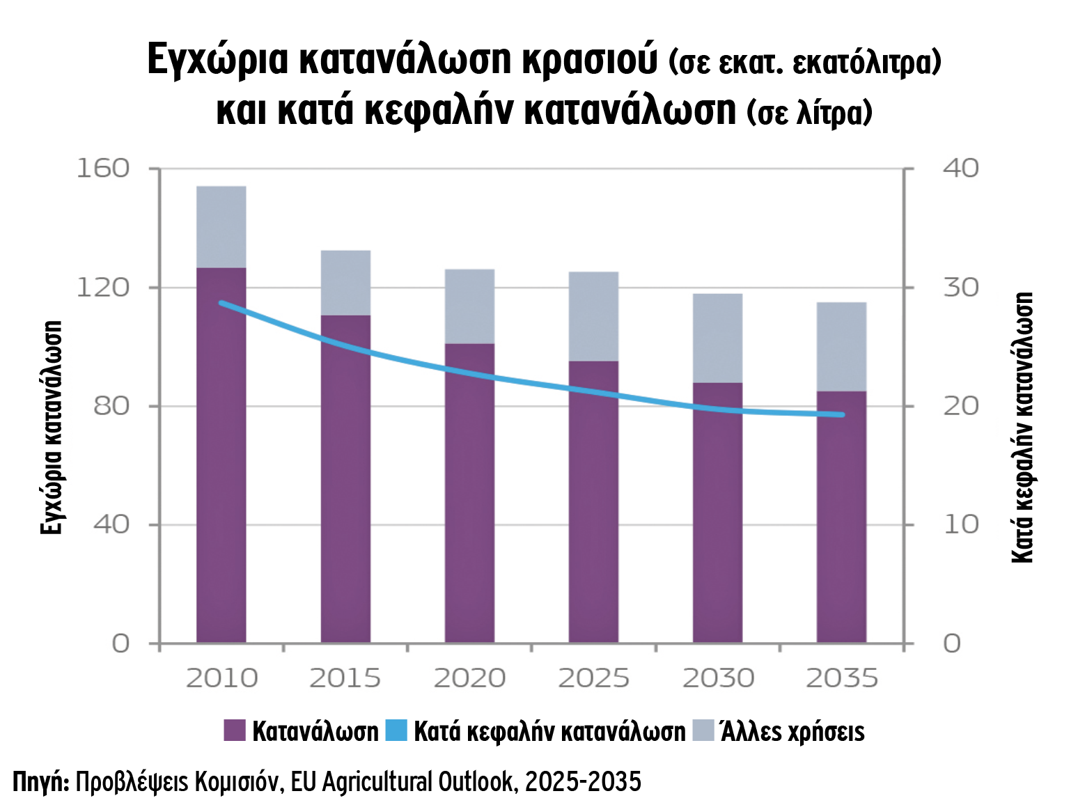 Η κατανάλωση κρασιού στην ΕΕ αναμένεται να μειωθεί κατά περίπου 0,9% ετησίως έως το 2035, φτάνοντας στα 19,3 λίτρα ανά κάτοικο (από 21,2 λίτρα κατά μέσο όρο το 2021-2025). Αντίθετα, οι «άλλες χρήσεις» (π.χ. απόσταξη ή μετατροπή σε επεξεργασμένα προϊόντα) διατηρούν ένα σταθερό επίπεδο, το οποίο κυμαινόταν γύρω στα 30 εκατ. εκατόλιτρα ετησίως έως το 2023.