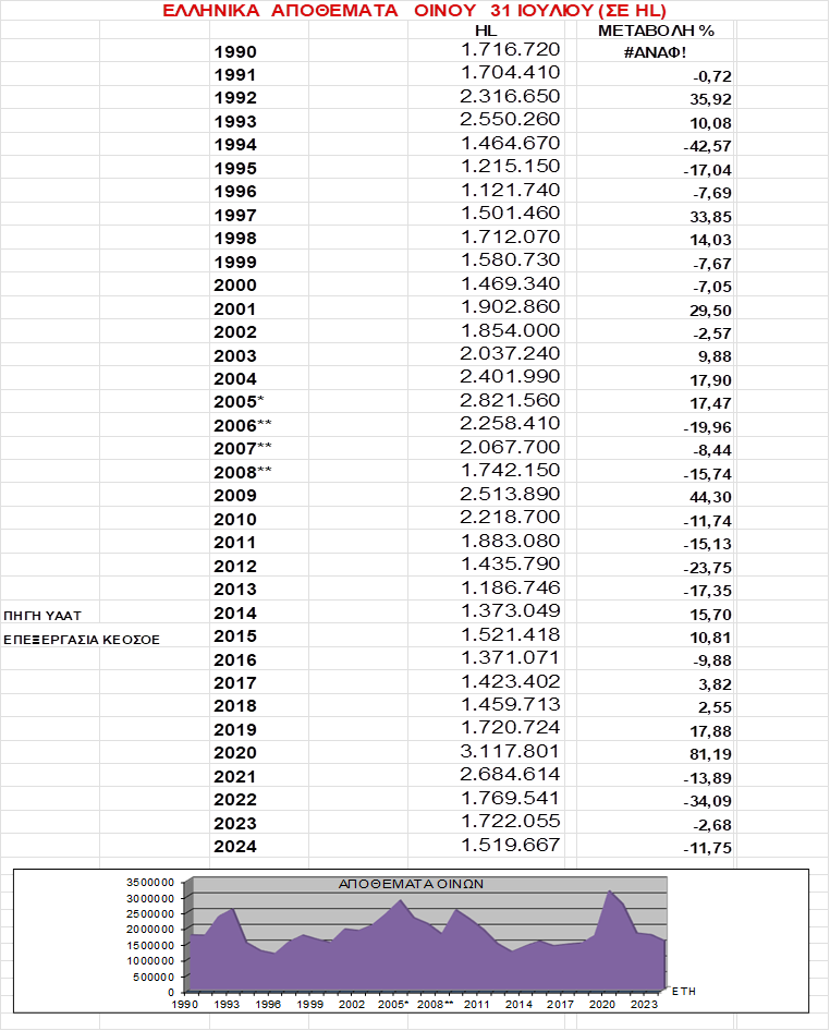 Ακολουθεί ο διαχρονικός πίνακας εξέλιξης των αποθεμάτων οίνων και γλευκών, από το 1990 έως το 2024:
