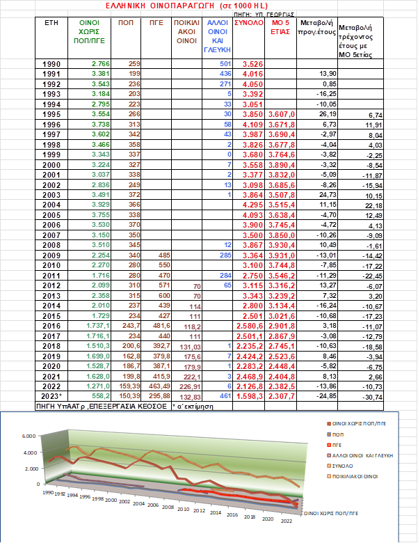 Ακολουθεί πίνακας με την εξέλιξη της ελληνικής οινοπαραγωγής από το 1990 μέχρι σήμερα, στον οποίο αποτυπώνεται η διαχρονική μείωση της παραγωγής οίνου στη χώρα μας, που όμως δεν οφείλεται στην κλιματική κρίση μόνο, αλλά κυρίως στην εγκατάλειψη της αμπελοκαλλιέργειας.