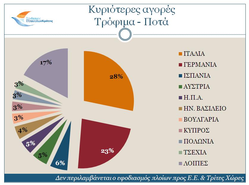 Για τον κλάδο των Τροφίμων & Ποτών, τους κυριότερους αγοραστές αποτελούν η Ιταλία με τις εξαγωγές να φτάνουν τα 70,2 εκ. ευρώ, η Γερμανία με 57,1 εκ. ευρώ, η Ισπανία με 14 εκ. ευρώ, η Αυστρία με 12,8 εκ. ευρώ και στην πέμπτη θέση Οι Η.Π.Α. με 11,1 εκ. ευρώ.