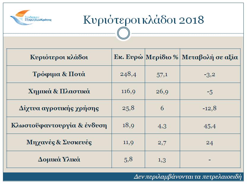 Με αρνητικό πρόσημο και ελαφριά μείωση που φτάνει σχεδόν το 2% έκλεισαν οι Κρητικές εξαγωγές για το έτος 2018, σε σχέση με το 2017, βάσει των προσωρινών στοιχείων της Ελληνικής Στατιστικής Αρχής, τα οποία επεξεργάστηκε ο Σύνδεσμος Εξαγωγέων Κρήτης.