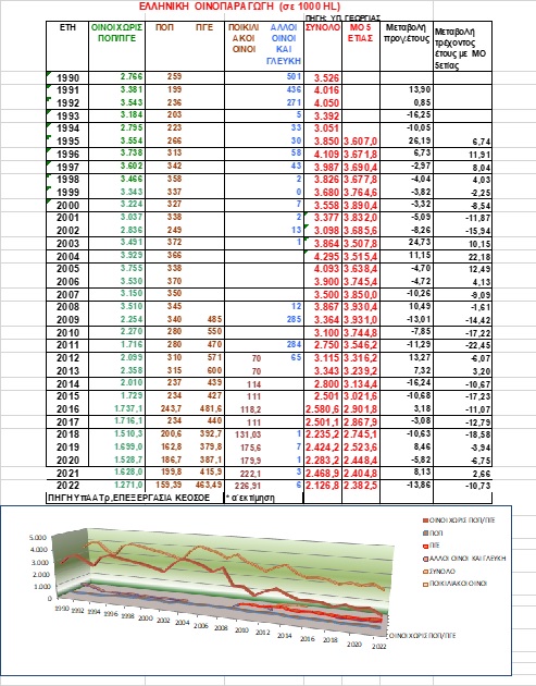 Ακολουθεί διαχρονικός πίνακας της ελληνικής οινοπαραγωγής 1990-2022, σύμφωνα με τον οποίο διαπιστώνεται μείωση της οινοπαραγωγής από το 1990 κατά 40% περίπου σε μέσους όρους.