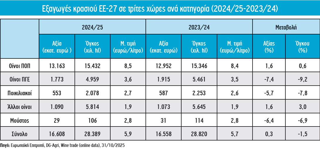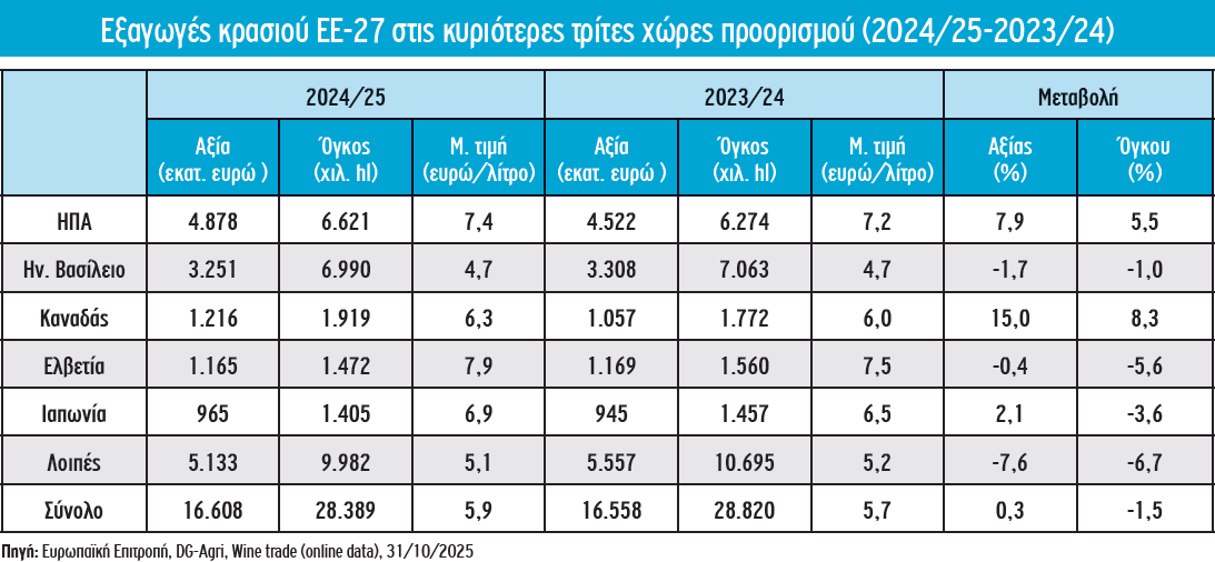 Ωστόσο, στο σύνολό του, ο όγκος των εξαγωγών κρασιού της ΕΕ μειώθηκε την περίοδο 2024/25 σε 28,4 εκατ. εκατόλιτρα, παρουσιάζοντας κάμψη ως προς την προηγούμενη (-1,5%), ενώ οριακή θεωρείται η μεταβολή ως προς την αξία, που εκτιμάται σε 16,6 δισ. ευρώ, παρά τη μικρή βελτίωση της μέσης τιμής εξαγωγής που ανήλθε σε 5,9 ευρώ/λίτρο.