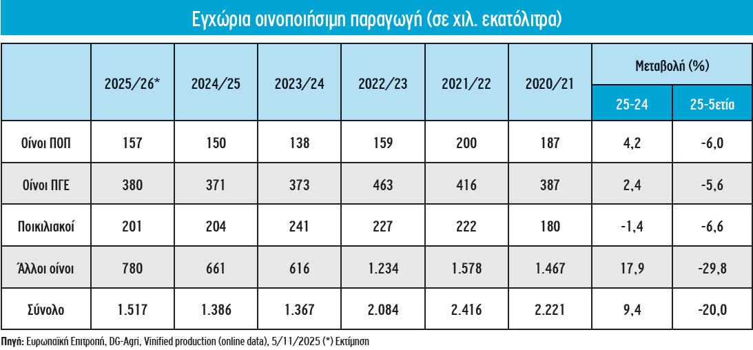 Η εγχώρια οινοποιήσιμη παραγωγή (εξαιρουμένου του μούστου), σύμφωνα με πρόσφατες εκτιμήσεις της Ευρωπαϊκής Επιτροπής, προβλέπεται την περίοδο 2025/26 να ανέλθει σε 1.517 χιλ. εκατόλιτρα, παρουσιάζοντας αισθητή άνοδο (+9,4%) ως προς την προηγούμενη. Ωστόσο, εξακολουθεί να υπολείπεται σημαντικά από τον μέσο όρο της προηγούμενης πενταετούς περιόδου (-20%) λόγω των εξαιρετικά δυσμενών καιρικών συνθηκών που επικράτησαν στους αμπελώνες της χώρας κατά τη διετία 2023-2024, με συνέπεια την έντονη μείωση της απόδοσης.
