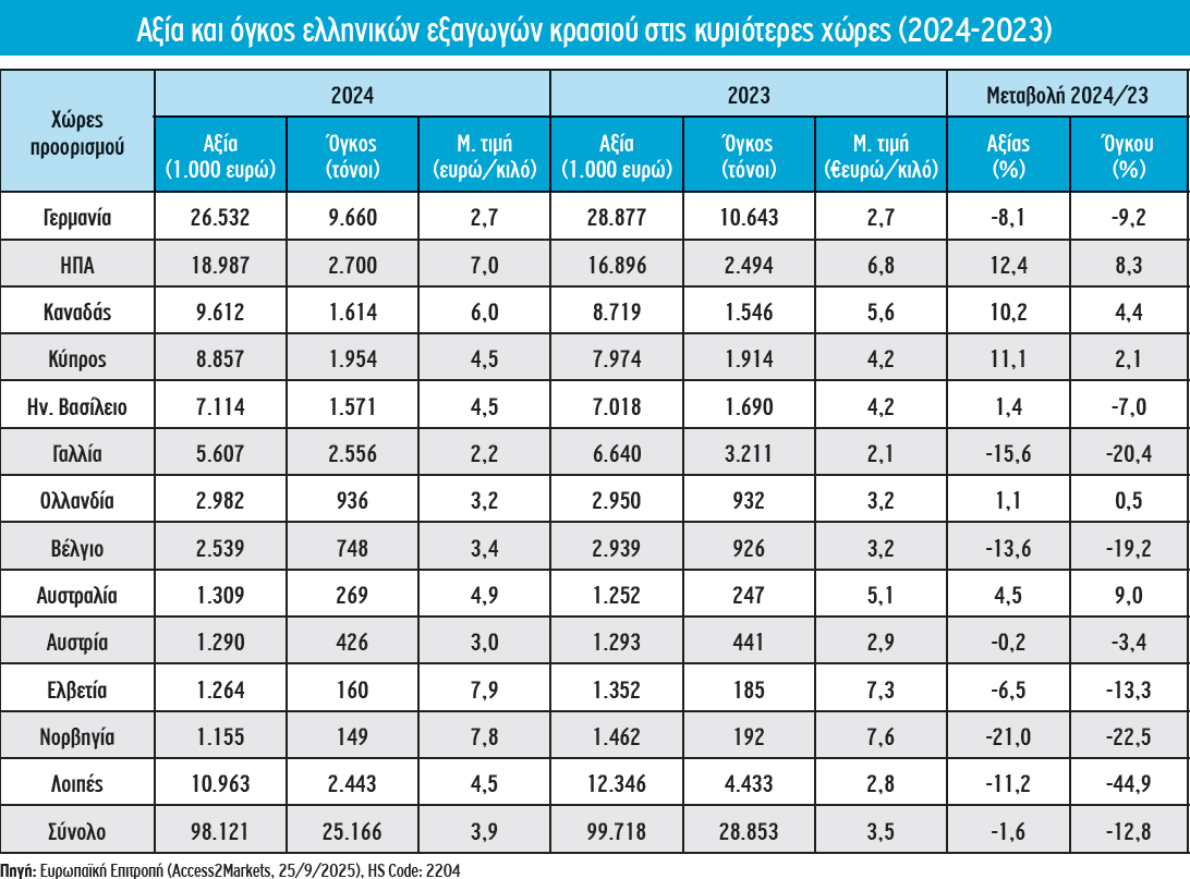 Σε ετήσια βάση, οι ελληνικές εξαγωγές κρασιού περιορίστηκαν το 2024 σε 25.166 τόνους, αξίας 98 εκατ. ευρώ, καταγράφοντας έντονη μείωση ως προς το προηγούμενο έτος στον όγκο (-12,8%) και μικρότερη στην αξία (-1,6%) λόγω της βελτίωσης της μέσης τιμής εξαγωγής (3,9 ευρώ/κιλό).