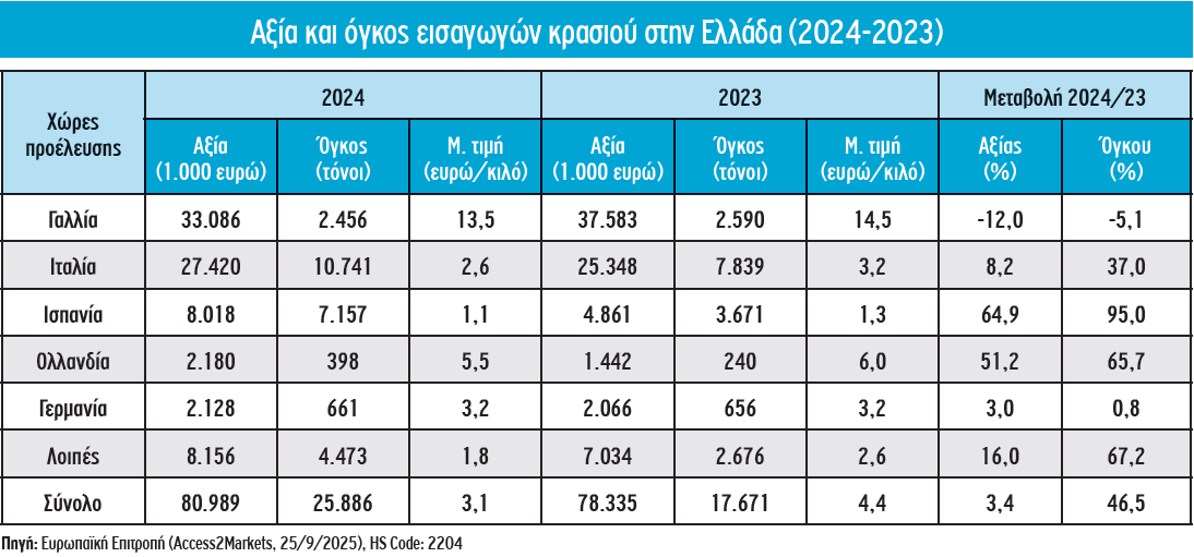 Από την άλλη πλευρά, όμως, στο διάστημα των τελευταίων ετών καταγράφεται μεγάλη άνοδος των εισαγωγών κρασιού στην ελληνική αγορά. Να σημειωθεί ότι το 2024 οι εισαγωγές ανήλθαν σε 25.886 τόνους, παρουσιάζοντας ιδιαίτερα έντονη αύξηση ως προς το προηγούμενο έτος (+46%), με αποτέλεσμα την ανατροπή στο εμπορικό ισοζύγιο του τομέα, το οποίο για πρώτη φορά επί σειρά ετών κατέστη αρνητικό ως προς τον όγκο (-720 τόνοι).