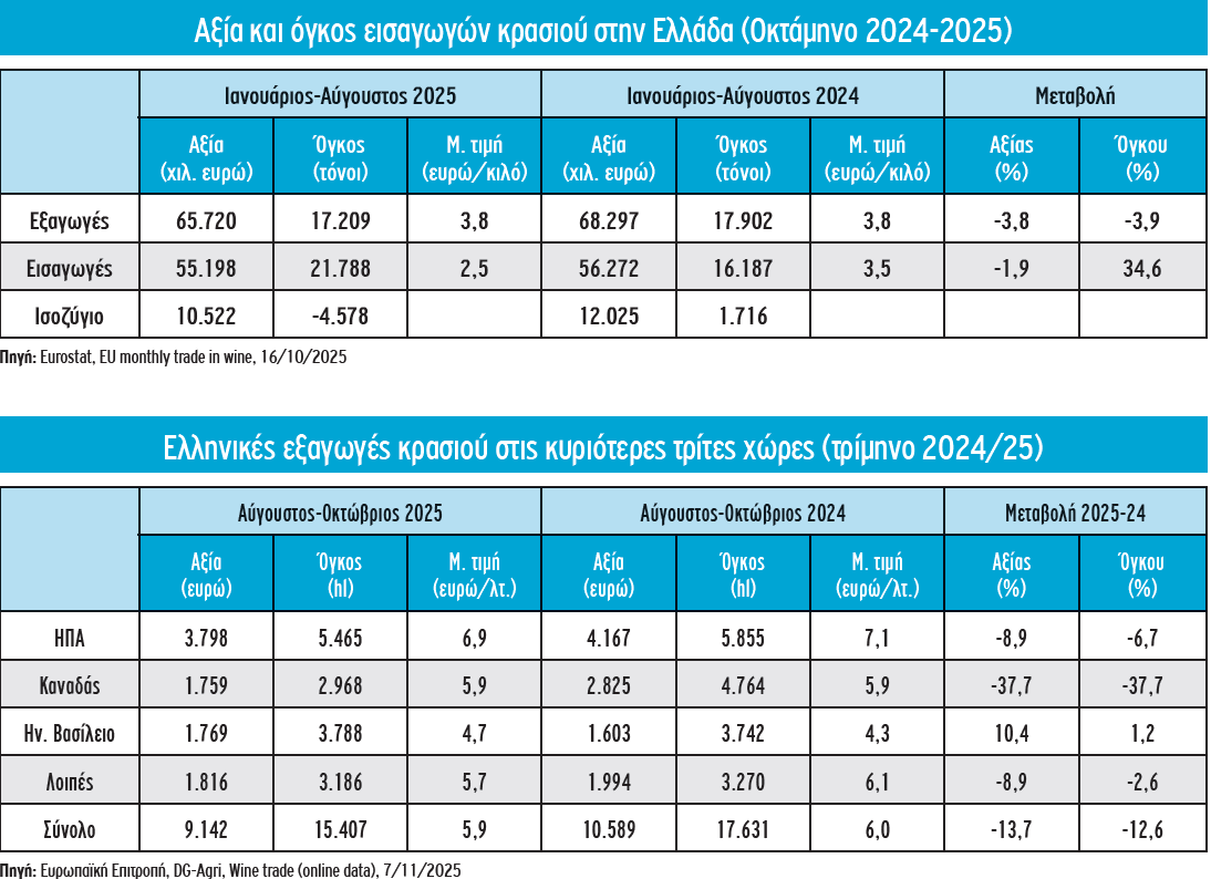 Πρόκειται για την πλέον κρίσιμη πρόκληση που αντιμετωπίζει ο αμπελοοινικός τομέας της χώρας επί σειρά ετών, η οποία εντάθηκε στη διάρκεια του τρέχοντος έτους, μια και, όπως προκύπτει από πρόσφατες εκτιμήσεις (στοιχεία Eurostat, 16/10/2025), στο διάστημα Ιανουαρίου-Αυγούστου του 2025, οι εισαγωγές κρασιού στην Ελλάδα ανήλθαν σε 21.788 τόνους, μέγεθος έντονα αυξημένο ως προς το αντίστοιχο οκτάμηνο του 2024 (+34,6%) και με μειωμένη μέση τιμή εισαγωγής. Αντίθετα, οι εξαγωγές περιορίστηκαν σε 17.209 τόνους (-3,9%), με συνέπεια την περαιτέρω διεύρυνση του ελλείμματος στο εμπορικό ισοζύγιο του τομέα (-4.578 τόνοι).