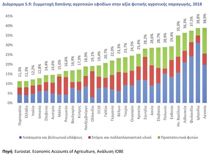 Επιπλέον, η μακροχρόνια τάση της κατανάλωσης λιπασμάτων στην Ελλάδα είναι έντονα πτωτική. «Από το μέσο της δεκαετίας του 1980, όταν κατέγραψε τη μέγιστη τιμή της (2,3 εκατ. τόνοι), η κατανάλωση λιπασμάτων υποχώρησε κάτω από τους 700.000 τόνους το 2015 (μείωση κατά 70%) για να ανακάμψει στη συνέχεια. Η ετήσια δαπάνη για την αγορά λιπασμάτων και βελτιωτικών εδάφους στην Ελλάδα έχει σταθεροποιηθεί την τελευταία τριετία κοντά στα 300 εκατ. ευρώ», σημειώνεται.