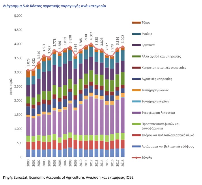 Η κατά πολύ μικρότερη συμμετοχή του κόστους στην αξία παραγωγής μέχρι το μέσο της δεκαετίας του 2000 οφείλεται τόσο στην υψηλότερη αξία της παραγωγής, όσο και στις χαμηλότερες τιμές των εισροών». Σύμφωνα με τη μελέτη, την περίοδο 2000-2008 αυξήθηκαν οι τιμές σε όλες τις εισροές και συγκεκριμένα στα λιπάσματα 114%, στην ενέργεια και στα λιπαντικά 75%, στους σπόρους 44,2% και στα φυτοφάρμακα 25,5% (στοιχεία ΕΛΣΤΑΤ). Επιπλέον, το 2018 οι τιμές των σπόρων ήταν κατά 8,2% υψηλότερες σε σύγκριση με το 2008, ενώ οι τιμές των γεωργικών φαρμάκων ήταν κατά 6,2% υψηλότερες. Πάντως, ο μελετητής σχολιάζει ότι «οι τιμές των λιπασμάτων βρίσκονταν το 2018 στο επίπεδο που είχαν το 2009, αλλά έχει ενδιαφέρον να παρατηρήσουμε ότι από το 2013 υποχώρησαν κατά 5,6%».