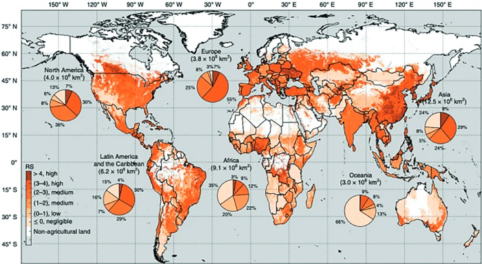 Το πανεπιστήμιο του Σίδνεϊ δημιούργησε έναν παγκόσμιο χάρτη γεωργικών γαιών σε 168 χώρες που δείχνει ότι τα 2/3 της αγροτικής γης (64%) αντιμετωπίζουν κίνδυνο ρύπανσης από τα προϊόντα φυτοπροστασίας. Σχεδόν το 1/3 αυτών λογίζονται ως εκτάσεις σε υψηλό κίνδυνο.