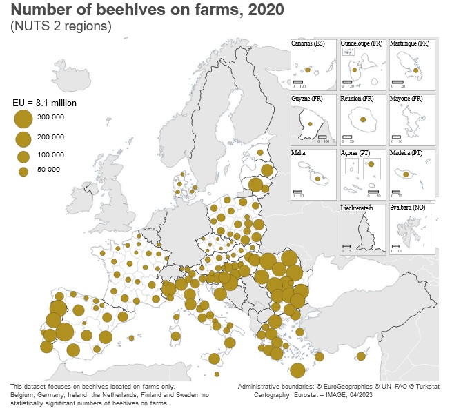Το 2020, υπήρχαν 8,1 εκατομμύρια κυψέλες σε εκμεταλλεύσεις της ΕΕ. Αυτή δεν είναι παρά η μερική εικόνα για τον αριθμό όλων των κυψελών στην ΕΕ, επειδή η Αγροτική Απογραφή καταγράφει μόνο τα μελίσσια σε αγροκτήματα (σε ορισμένες χώρες, όπως η Γερμανία, τα μελίσσια δεν θεωρούνται μέρος των εκμεταλλεύσεων).