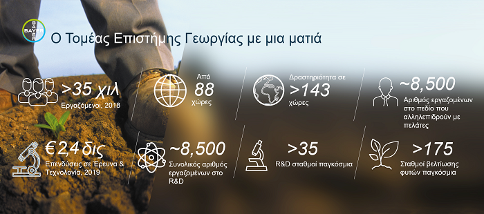 Για την ανάπτυξη της καινοτομίας περίπου 8.500 επιστήμονες εργάζονται σε περισσότερα από 35 κέντρα έρευνας και ανάπτυξης και 175 σταθμούς γενετικής βελτίωσης φυτών. Παράλληλα, η ανάπτυξη τα επιστήμης των δεδομένων και των καινοτόμων ψηφιακών εργαλείων επιτρέπουν στη Bayer να παρέχει τη δυνατότητα στους παραγωγούς να επιλέγουν τις βέλτιστες γεωργικές πρακτικές σχετικά με τον τρόπο διαχείρισης των καλλιεργειών τους.