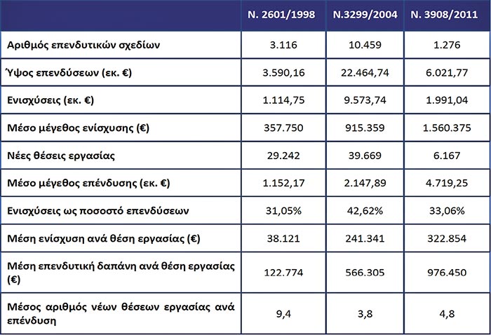Ιδιαίτερο ενδιαφέρον παρουσιάζουν και τα στοιχεία για τους προηγούμενους αναπτυξιακούς που περιλαμβάνονται στην ανάλυση που συνοδεύει το κατατεθέν νομοσχέδιο στη Βουλή. Όπως προκύπτει από αυτά, στους ν. 2601/1998, 3299/2004 και 3908/2011 εντάχθηκαν επενδύσεις συνολικού ύψους 32 δισ. ευρώ, ενώ το συνολικό ύψος της κρατικής ενίσχυσης των ενταχθέντων επενδυτικών σχεδίων ανήλθε στα 12,5 δισ. ευρώ.