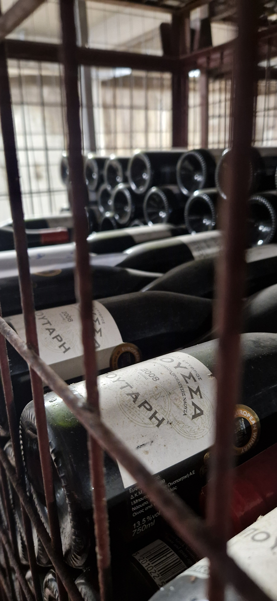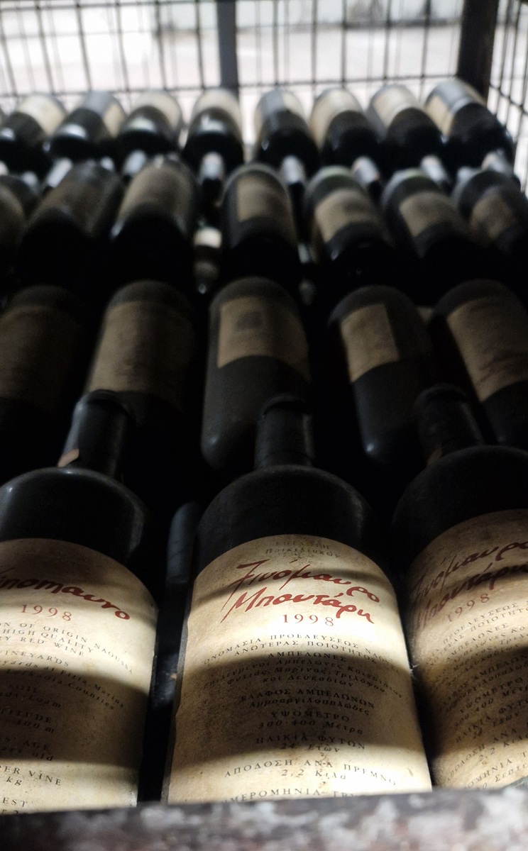 «Νιώθεις δέος σε αυτόν τον χώρο» λέει στο ΑΠΕ-ΜΠΕ ο οινολόγος Βασίλης Γεωργίου, περιγράφοντας τι βλέπει ο επισκέπτης/τρια. Οι φιάλες των κρασιών αναπαύονται πλαγιαστές σε μεγάλα σιδερένια καλάθια, τοποθετημένα το ένα πάνω στο άλλο, σε στήλες που ορθώνονται σε ύψος έως και τριών μέτρων, δημιουργώντας την αίσθηση των τοιχωμάτων ενός λαβυρίνθου, όταν περπατάς ανάμεσά τους. Στις ιδιαίτερες αυτές «στήλες» κρύβονται διαμάντια, φτιαγμένα σε εποχές, που μοιάζουν να απέχουν έτη φωτός από τη σημερινή. Μεταξύ αυτών, περίπου 80 φιάλες του οίνου «Νάουσσα Μπουτάρη», που εμφιαλώθηκαν το 1968. Οι ετικέτες τους είναι ταλαιπωρημένες και η φιάλη σκονισμένη, όπως αρμόζει σε ένα κρασί που παλαιώνει για περισσότερο από μισό αιώνα, σημειώνει ο κ. Γεωργίου και προσθέτει ότι η εμφιάλωση του κρασιού της συγκεκριμένης εσοδείας συνοδεύεται από μια ιστορία που διαδίδεται από στόμα σε στόμα χρόνια τώρα και ας μην έχει επιβεβαιωθεί ποτέ επίσημα, όπως διευκρινίζει.