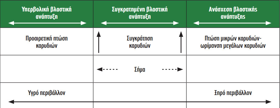 Η ισορροπία της βλαστικής και αναπαραγωγικής ανάπτυξης είναι πολύ σημαντική, όχι μόνο για την παραγωγή, αλλά και για την ποιότητα του προϊόντος. Συνεπώς, ο παραγωγός θα πρέπει να φροντίσει την καλλιέργεια λαμβάνοντας υπόψη αυτήν τη διάσταση. Η υπερβολική βλαστική ανάπτυξη μπορεί να προκύψει από υπερβολική εδαφική υγρασία, ως συνέπεια υπερβολικής άρδευσης ή βροχής μετά από προγραμματισμένη άρδευση.