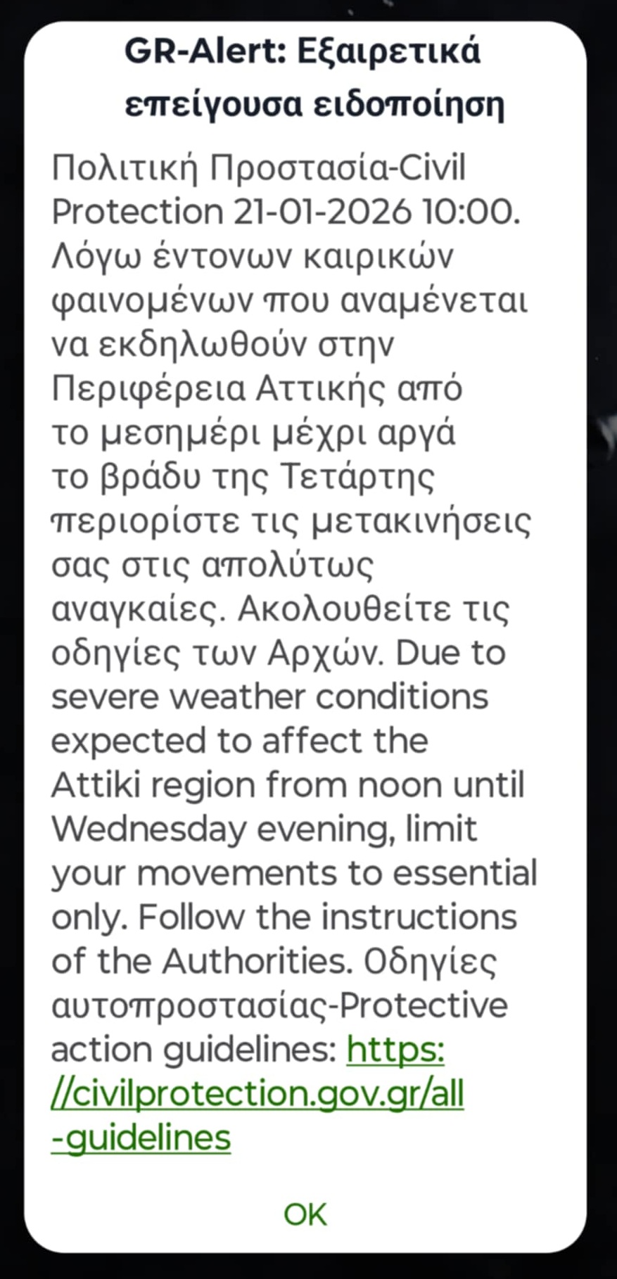 Συγκεκριμένα το μήνυμα αναφέρει: «Λόγω έντονων καιρικών φαινομένων που αναμένεται να εκδηλωθούν στην Περιφέρεια Αττικής από το μεσημέρι μέχρι αργά το βράδυ της Τετάρτης περιορίστε τις μετακινήσεις σας στις απολύτως αναγκαίες. Ακολουθείτε τις οδηγίες των αρχών».