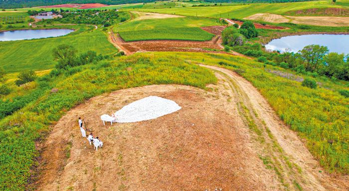 Χρησιμοποιώντας 200 κιλά ακατέργαστου βαμβακιού σε τσουβάλια, οι μαθητές δημιούργησαν ένα φόρεμα μοναδικής ομορφιάς. Κάθε βελονιά, κάθε ραφή και κάθε στιγμή συνεργασίας αποτελούν μια αναγνώριση της αξίας της αμοιβαίας συνεργασίας, της αγάπης για το περιβάλλον και της προώθησης του τόπου τους.