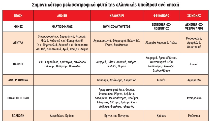 Στον πίνακα που ακολουθεί δίνονται ανά εποχή άνθισης τα σημαντικότερα μελισσοτροφικά φυτά της ελληνικής χλωρίδας. Ως µελισσοκοµικό ή μελισσοτροφικό φυτό χαρακτηρίζεται το φυτό που παρέχει τροφή στη µέλισσα, η οποία είναι σε μορφή νέκταρ, µελιτώµατος ή/και γύρης. Το χρονικό διάστημα που ένα φυτό δίνει νέκταρ ή γύρη ονομάζεται µελιτοφορία.