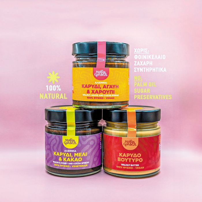 Επίσης, τα καρύδια και τα αμύγδαλα μεταποιούνται σε αλείμματα και μπάρες χωρίς ζάχαρη, φοινικέλαιο και συντηρητικά. «Για την παραγωγή τους συνεργαζόμαστε με μονάδα μεταποίησης που διαθέτει και βιολογική πιστοποίηση. Όσον αφορά την προώθησή τους, ταξιδεύουν σε αρκετά νησιά και στη Θεσσαλονίκη, ενώ τώρα κάνουμε ένα άνοιγμα στην Κρήτη, όπου υπάρχει ενδιαφέρον», αναφέρει η Μαρία.