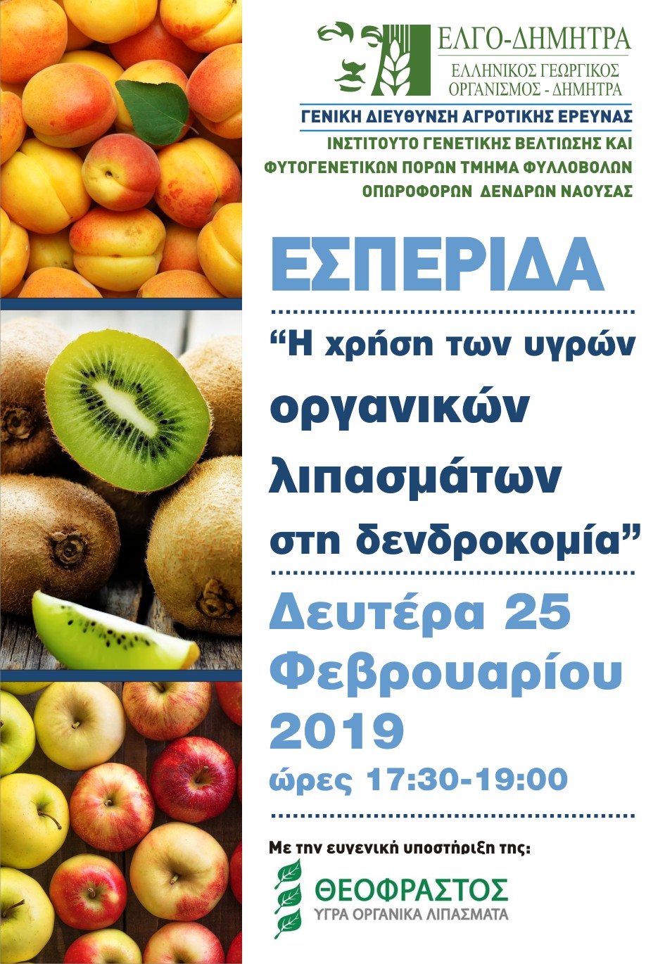Το Τμήμα Φυλλοβόλων Οπωροφόρων Δένδρων Νάουσας του Ινστιτούτου Γενετικής Βελτίωσης και Φυτογενετικών Πόρων, διοργανώνει, τη Δευτέρα 25 Φεβρουαρίου 2019 από τις 5:30 έως τις 7:00 μμ. εσπερίδα με θέμα ‘Η χρήση των υγρών οργανικών λιπασμάτων στη δενδροκομία’. H εσπερίδα θα πραγματοποιηθεί στις εγκαταστάσεις του στη Νάουσα.