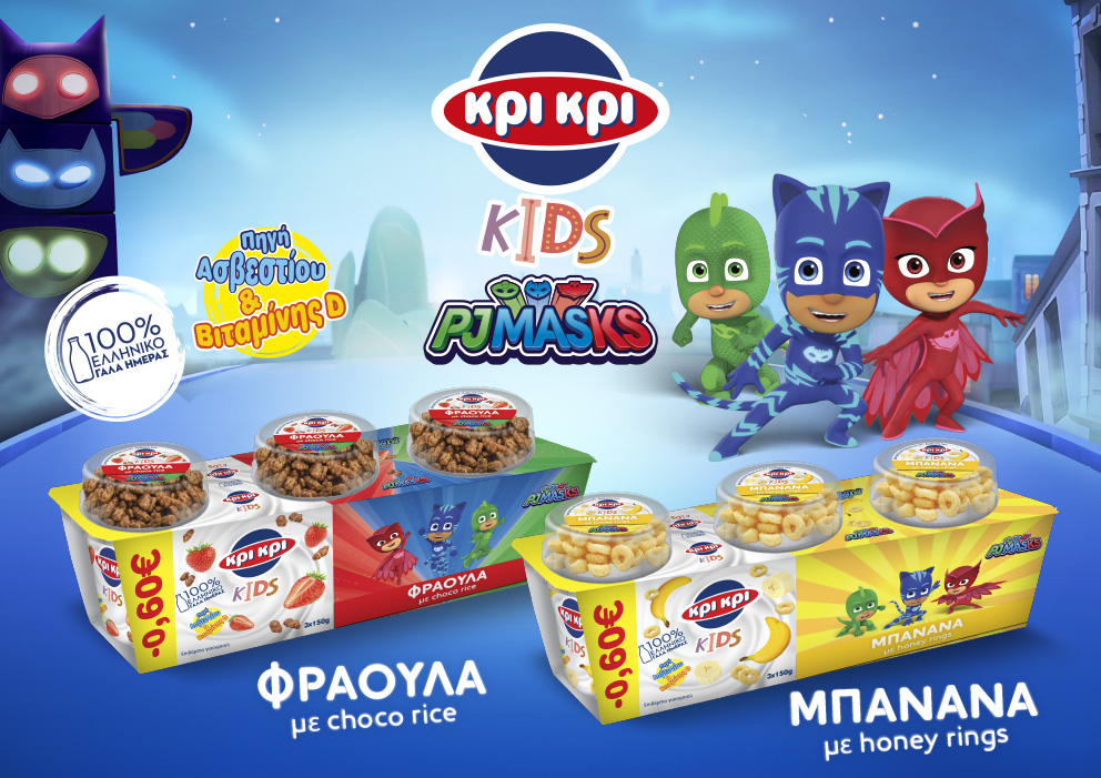 Ακολουθώντας την φιλοσοφία της σειράς, τα νέα Κρι Κρι Kids PJ Masks είναι ειδικά σχεδιασμένα για να καλύπτουν τις ανάγκες των παιδιών προσχολικής ηλικίας και τις απαιτήσεις κάθε γονιού. Η νέα σειρά επιδορπίων γιαουρτιού με δημητριακά διαθέτει δύο αγαπημένους γευστικούς συνδυασμούς: φράουλα με σοκολατένια δημητριακά ρυζιού και μπανάνα με μελένια δαχτυλίδια δημητριακών. Παρασκευάζονται μόνο με 100% ελληνικό γάλα ημέρας και είναι εμπλουτισμένα με ασβέστιο και βιταμίνη D, στοιχεία απαραίτητα για την ανάπτυξη των οστών και δοντιών. Μάλιστα αποτελούν αγαπημένη επιλογή, καθώς έχουν 50%* λιγότερα λιπαρά, 22% λιγότερες θερμίδες και 20%* λιγότερα σάκχαρα. Οι 3 υπερήρωες με πιτζάμες, ο Cat boy, ο Gecko και η Owlette, θα συνοδεύουν όλο το 24ώρο το θρεπτικό γεύμα των παιδιών, με δράση και ομαδικό πνεύμα.