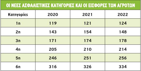 Τα παραπάνω ποσά «στρογγυλοποιημένα» είναι αυτά που προβλέπονται ως εισφορές της πρώτης χαμηλότερης ασφαλιστικής κατηγορίας στο σχέδιο, στο οποίο φαίνεται ότι έχει καταλήξει το υπουργείο Εργασίας. Συγκεκριμένα, στην πρώτη κατηγορία, η εισφορά ορίζεται σε 119 ευρώ/μήνα για το 2020, σε 121 ευρώ για το 2021 και σε 123 ευρώ για το 2022. Οι αγρότες, όπως και οι υπόλοιποι μη μισθωτοί, θα έχουν τη δυνατότητα να επιλέξουν μία από τις πέντε υψηλότερες κατηγορίες (και, κατ’ επέκταση, υψηλότερες εισφορές), εφόσον το επιθυμούν, προσβλέποντας σε καλύτερη σύνταξη. Στη δεύτερη κατηγορία, το συνολικό ασφάλιστρο διαμορφώνεται σε 143 ευρώ για το 2020, σε 146 ευρώ για το 2021 και σε 148 ευρώ για το 2022, ενώ στην τρίτη κατηγορία σε 171 ευρώ το 2020, σε 174 ευρώ το 2021 και σε 178 ευρώ το 2022. Στην έκτη και ανώτερη ασφαλιστική κατηγορία, η εισφορά θα ανέρχεται σε 319 ευρώ το 2020, σε 326 ευρώ το 2021 και σε 324 ευρώ το 2022.