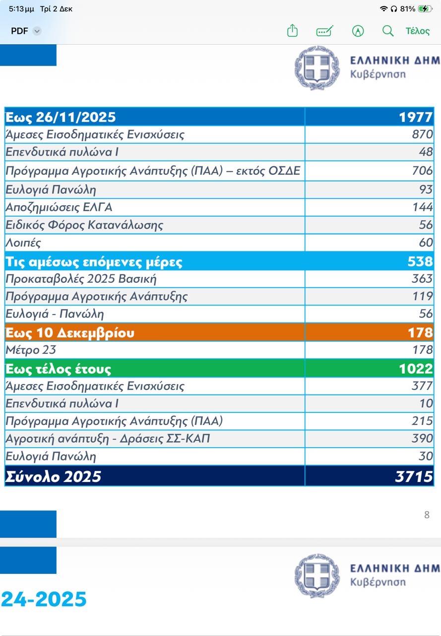 - Συνολικά φέτος οι πληρωμές για τους αγρότες θα είναι υψηλότερες σε σχέση με το 2024 και θα φτάσουν συνολικά τα 3,7 δισεκατομμύρια ευρώ. Μόνο από τον ΟΠΕΚΕΠΕ θα καταβληθούν 3,3 δισεκατομμύρια έναντι 2,7 δισ. που ήταν πέρυσι καθώς οι πληρωμές από τον δεύτερο πυλώνα της ΚΑΠ, που αφορά τον εκσυγχρονισμό των εκμεταλλεύσεων θα φτάσουν σε επίπεδα ρεκόρ.