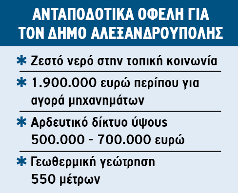 Από τα ανταποδοτικά οφέλη του αγωγού, συνολικού ύψους 32.000.000 ευρώ, ο Δήµος Αλεξανδρούπολης θα λάβει 1.900.000 ευρώ. Σε αυτά, ο κ. Φαλέκας εξηγεί πως δεν εντάσσεται η τηλεθέρµανση, καθώς πρόκειται για µια ξεχωριστή διεκδίκηση του δήµου.